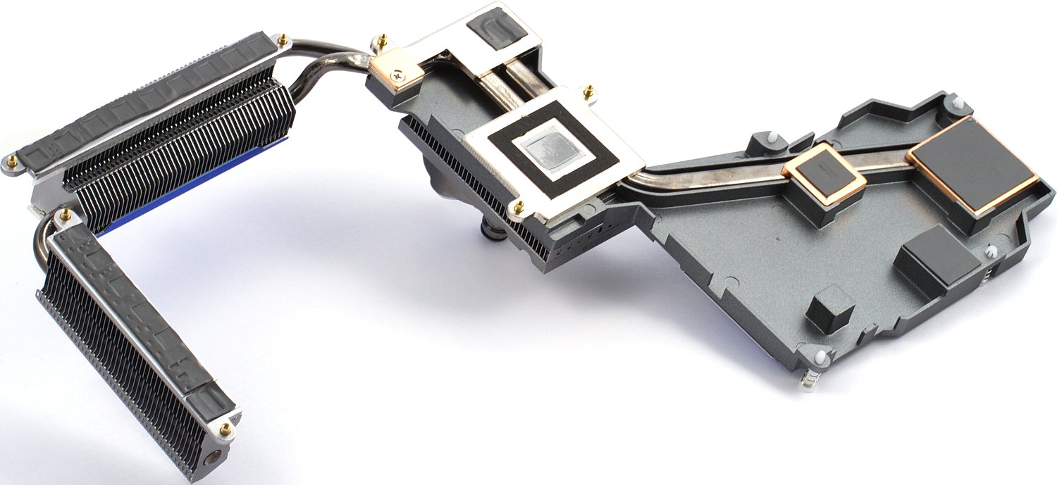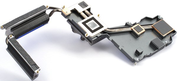 Штатная система охлаждения выглядит впечатляюще. Много радиаторов, эдакая монолитная плита на южном мосту, неизбежные тепловые трубки… А почему, собственно, вообще возникла нужда в усиленном охлаждении? Конечно, топовая плата, статус вынуждает и все такое прочее… Однако чипсет (точнее, северный мост) не настолько уж горячий (TDP 24 Вт), а про огромное количество каналов конвертера питания процессора мы только что говорили: даже если каждый модуль DrMOS будет рассеивать по 2 Вт — это худший сценарий при 12 работающих на частоте 1 МГц каналах для 130-ваттного процессора под полной нагрузкой — их просто слишком много, так что точечный съем тепла неактуален. (А микросхемы DrMOS, расположенные на оборотной стороне печатной платы, все равно никак не охлаждаются и прекрасно себя при этом чувствуют.) Да и в любом случае: зачем тепловая трубка от южного моста? Просто для красоты?