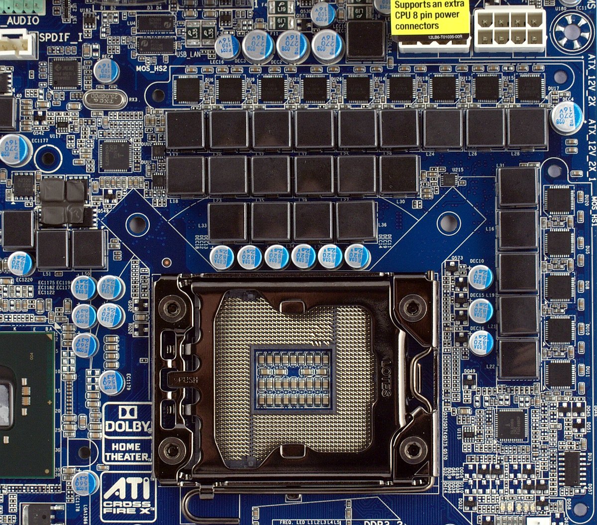 Однако подбором электронных компонентов достоинства схемы питания X58A-UD9 не исчерпываются. Нет, конечно, как и у всех современных топовых моделей, здесь использованы экранированные катушки индуктивности с ферритовым сердечником и только качественные полимерные конденсаторы японского производства (Fujitsu) по всей плате. Кроме того, в традициях Gigabyte, слои питания и заземления в текстолите выполнены вдвое более толстыми, чем у остальных производителей, что должно, по идее, улучшить теплообмен. Есть и еще одна любопытная технология (Dual Power Switching): суть ее в том, что в норме преобразователь напряжения ядра процессора работает не со всеми 24 каналами, а лишь с 12 из них. Другие 12 используются при следующем включении системы, то есть нагрузка и износ приходятся попеременно то на одни электронные компоненты, то на другие. Понятно, что это поможет продлить срок службы преобразователя. Более того, при выходе из строя компонентов в одной из половин, вторая будет использоваться в постоянном режиме, обеспечивая, таким образом, некоторую защиту от поломок. В случае же, если ток через работающую 12-канальную половину становится слишком велик (процессор сильно разогнан и находится под нагрузкой), схема автоматически переключается в 24-канальный режим, обеспечивая все преимущества большого числа каналов.