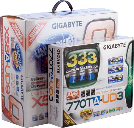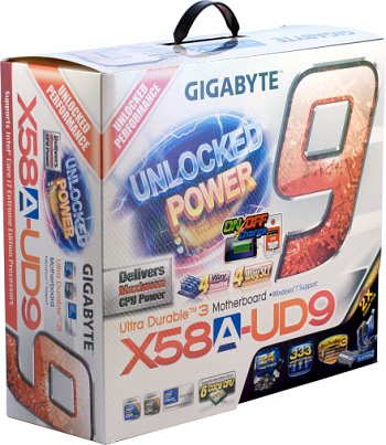 Если же попробовать на минуту отстраниться от специфики X58A-UD9 в области поддержки видеокарт, то нетрудно заметить просто по названию модели, что цифровой индекс (UD9) у нее на текущий момент максимальный, так что в этой плате реализовано абсолютное большинство современных технологий компании. Плата (согласно тому же названию) основана на топовом чипсете Intel X58 и, значит, предназначена для платформы Socket 1366, для которой с полгода назад были выпущены 6-ядерные процессоры — разумеется, от топовой модели приходится ожидать их поддержки. Кроме того, литера A (X58A) говорит о том, что это второе поколение плат на X58, в котором все производители массово реализовали поддержку USB 3.0 и SATA-III (пусть и не оптимальным образом, с учетом сегодняшних ограничений). Что ж, осмотрим плату внимательнее.