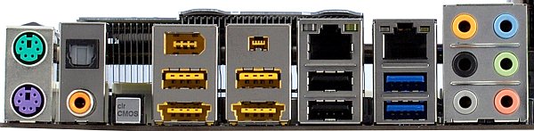 Как видите, в плане периферийной функциональности от платы нечего желать. Реализованы все мыслимые на сегодня интерфейсы, многие с запасом, есть поддержка USB 3.0 и SATA-III — пусть не самыми быстрыми, вероятно, контроллерами, но единственными доступными на текущий момент, и без проблем с подключением, так как северный мост чипсета имеет лишние периферийные линии PCI Express 2.0 x1. Порты eSATA на задней панели совмещены с портами USB, что позволяет подключить одним специальным кабелем устройства, получающие с контактов USB питание и передающие данные со скоростью eSATA. Кроме того, это обеспечивает лишнюю пару портов USB, если вам не требуются eSATA. В качестве контроллера FireWire выбран качественный чип TI (а не более распространенные решения VIA), в штатном наборе портов задней панели есть не только обычный, 6-контактный разъем, но и 4-контактный mini-FireWire, так что вам даже не придется возиться с переходниками при подключении видеокамер или других устройств с соответствующими выходами. Словом, производитель не упустил ни единой мелочи, которую 600-долларовому продукту простить было бы трудновато.
