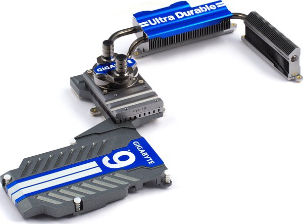 Что означает установка на плату моста nForce 200 с точки зрения необходимости его охлаждать? К сожалению, один из самых больших недостатков этого чипа заключается в его высоком тепловыделении (что неудивительно для хост-контроллера PCI Express 2.0). Теперь нам понятен вид обратной стороны системы радиаторов, по которой отчетливо заметно внимание, уделенное охлаждению именно двух мостов nForce 200: на них приходятся медные площадки, напрямую соединенные с плоской тепловой трубкой. (По фотографии также заметно, что весь «южный» радиатор — одна большая фикция.) Однако будет ли этого достаточно для двух горячих чипов NVIDIA и северного моста чипсета (южный с его 5-ваттным TDP милостиво не будем учитывать)? Дабы не ограничиваться возможностями набортной системы (которая по определению не может быть слишком габаритной), Gigabyte предлагает два способа увеличить эффективность.