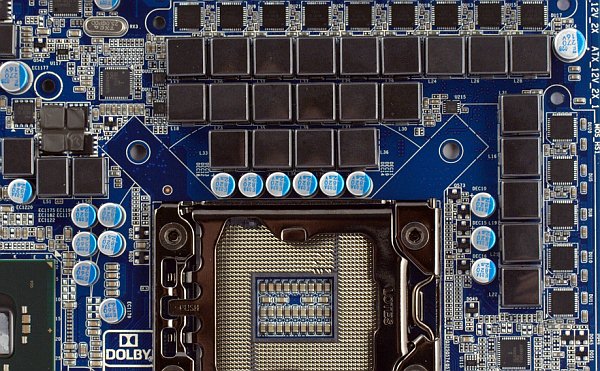 Конечно, одним частоколом слотов PCIEx16 топовые особенности платы не ограничиваются. Заявлена и ориентация на серьезный разгон, что немыслимо без качественной и сообразно мощной системы питания. Здесь Gigabyte тоже есть чем похвалиться: в списке характеристик значатся 24 ШИМ-канала, динамическое уменьшение числа активных каналов в простое, а также технология Dual Power Switching, позволяющая работать конвертеру питания как двум 12-канальным. Давайте разбираться. Ну, никакими 24 каналами на плате и не пахнет, и вообще нам неизвестны ШИМ-контроллеры для понижающего преобразователя напряжения, рассчитанные хотя бы на 10 каналов. В данном случае для подачи питания на ядро процессора на текстолите распаян вполне классический 6-канальный Intersil ISL6336 (и еще Intersil ISL6312, управляющий отдельным 3-канальным преобразователем напряжения для блока Uncore в процессоре).