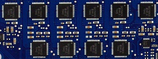 Тут надо сделать оговорку, что под «каналом» мы вполне традиционно понимаем модуль конвертера питания, срабатывающий с некоторой временно́й задержкой (сдвигом) относительно остальных. Если же понимать под ним, более отвлеченно, независимую составляющую конвертера питания, получающую на вход высокое напряжение, преобразующую его в пониженное на выходе за счет широтно-импульсной модуляции частым открытием-закрытием канала парой ключей (под управлением драйвера) и сглаживающую выходное напряжение LC-цепочкой, то таких каналов на X58A-UD9 действительно 24. Меньшее число каналов («в истинном смысле», 6 вместо 24) означает, что пульсации выходного напряжения окажутся выше, но зато при тех же характеристиках электронных компонентов 24 «канала» смогут пропустить гораздо более высокий ток, чем 6, обеспечивая качественное питание даже топовому процессору под сильным разгоном.