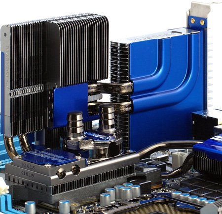 Во-первых, как хорошо видно на всех фотографиях, радиатор, монтируемый на северном мосту, имеет два патрубка для подключения к системе водяного охлаждения. Если же вы не готовы к такому радикальному решению, можно использовать промежуточный вариант. В комплекте с платой идет дополнительный выносной радиатор Hybrid Silent-Pipe 2, который устанавливается как карта расширения и закрепляется на задней стенке корпуса штатным образом. Он представляет собой странную конструкцию, к месту и не к месту использующую тепловые трубки, но теоретически действительно способен снять часть тепловой нагрузки с радиатора на северном мосту. Сопряжение стационарного и дополнительного радиаторов происходит на относительно небольшой площади, в основном контакт приходится на пару тепловых трубок, пластинка с которыми привинчивается к приемной части несколькими винтами. В целом такой вариант сопряжения (на верхней пластине чипсетного радиатора, отделенной от основания рядом тонких ребер) позволяет заключить, что главное предназначение дополнительного модуля — впечатлять на фотографиях. Hybrid Silent-Pipe 2 не имеет активного охлаждения и не предусматривает его — это часть общей системы, позволяющей, по мнению производителя, удержать температуру набортных компонентов в пределах нормы, не создав при этом никакого шума.