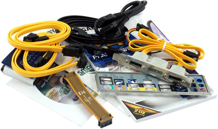 Внимание привлекает разве что фирменный набор для подключения eSATA- и SATA-дисков, не задействующий штатные порты eSATA (которые, как мы помним, работают не всегда). Он состоит из трех кабелей и одной планки. От традиционных «выкидышей» отличается тем, что кроме двух портов eSATA поддерживает и вывод наружу питания при помощи периферийного разъема, в фольклоре именуемого «молексом». Для подключения нормальных внешних жестких дисков это бесполезное архитектурное украшение, зато можно легко подключать/отключать винчестеры безо всяких «коробок» — для этого в комплект как раз и входят два интерфейсных кабеля eSATA-SATA и кабель питания, превращающий выходной разъем на планке в два коннектора питания SATA. Хоть какой-то оригинальный способ задействовать десяток внутренних разъемов SATA предложили.