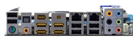 Задняя панель выглядит так, как, по нашему мнению, она должна выглядеть в топовых платах 2009 года. Внимание привлекают восемь портов USB, чего вполне достаточно даже для очень требовательного пользователя, так что вывод дополнительных четырех на заднюю панель корпуса не потребуется, и можно увеличить удобство пользования компьютером, выведя их на переднюю панель. При отсутствии потребности в eSATA число доступных портов USB возрастает до 10, что является рекордом для современных плат (причем, в отличие от 24-канального питания, более чем пригодным для практического использования), пусть P55-UD6 и не уникальна в этом достижении (впрочем, и все остальные платы с таким количеством «легкодоступных» USB выпускаются именно Gigabyte).