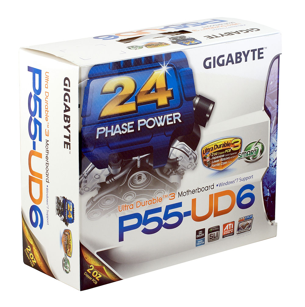 На первый взгляд, Gigabyte P55-UD6 больше всего напоминает не скромную трудягу среднего уровня для массовой платформы, а экстремальные модели на чипсете Х58 для процессоров в исполнении LGA1366 — как минимум, уровня EX58-UD5 того же производителя. Особенно на такие мысли наводит наличие трех слотов PCIEx16 и шести (!) слотов для памяти. Изначально планировалось снабдить данную модель поддержкой SATA600, однако из-за проблем с контроллером Marvell в последний момент от этой заманчивой идеи пришлось отказаться. Но и то, что осталось, достойно топового статуса — 10 портов SATA плюс еще 2 eSATA (что, кстати, для плат Gigabyte почти в новинку — долгое время даже на топовых моделях полноценная реализация eSATA отсутствовала), трехпортовый контроллер FireWire на чипе от Texas Instruments, два гигабитных сетевых контроллера, мощная система охлаждения из четырех радиаторов, связанных тепловой трубкой и т. п. Казалось бы — покупателю больше нечего желать. На самом деле, к сожалению, задействовать абсолютно все возможности платы одновременно не удастся, а часть их вполне может остаться невостребованной в принципе. Но обо всем по порядку.