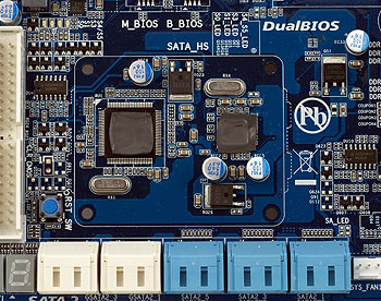 Но раз все успели полюбоваться на фотографии платы с десятком SATA-разъемов, пришлось выкручиваться. Компания Gigabyte просто предпочла вместо непонятно как работающих новых контроллеров установить давно проверенные временем JMB362 и JMB363. Оба встречаются очень часто (причем на платах разных производителей), да и реализация РАТА во втором зарекомендовала себя самым лучшим образом, не создавая ни малейших проблем с определением оптического накопителя при загрузке системы и под Windows, позволяя успешно выполнить загрузку с CD и т. д. Так что изначальные обещания производителем почти выполнены — плата действительно поддерживает очень большое количество накопителей, в том числе и пару РАТА (что для плат на чипсетах Intel, давно лишенных соответствующей поддержки, особенно актуально), а отсутствие SATA600… Честно говоря, если бы даже Marvell 88SE9123 не вызывал никаких проблем изначально, все равно он гарантированно оказался бы мишенью для критики с нашей стороны ввиду того, что такая поддержка все равно сгодится лишь для галочки, поскольку узким местом будет интерфейс подключения контроллера к чипсету.