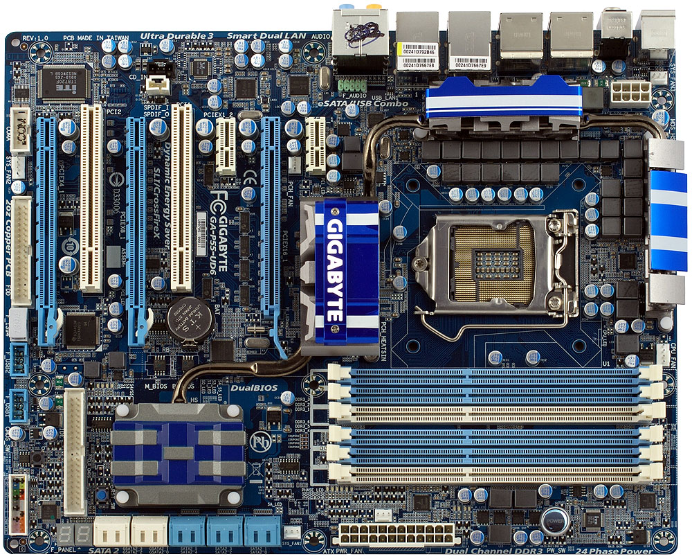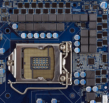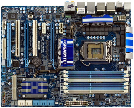 Но традиционные достоинства плат с поддержкой технологии Ultra Durable 3 (увеличенное количество меди в слоях питания и заземления, а также активное использование твердотелых конденсаторов японского производства) наверняка будут тепло встречены всеми пользователями. Во всяком случае, всеми готовыми платить за это — все-таки компании пришлось применить восьмислойный дизайн платы, да и прочие «навороты» достаются вовсе не бесплатно, так что в качестве основы для недорогого массового компьютера P55-UD6 не подойдет. Но для этого в ассортименте компании есть и другие платы, а вот для топовой конфигурации (особенно при «серьезном» разгоне и паре видеокарт) данная модель придется в самый раз.