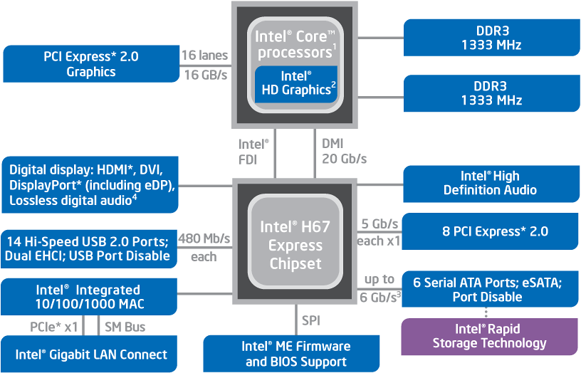 Новые чипсеты примерно сохранили (немного расширив) прежний уровень функциональности, но, как мы уже сказали, архитектурно это по-прежнему один-единственный мост с малым потреблением энергии, подключаемый к процессору по шине DMI (только теперь новой версии), а также по специальному интерфейсу FDI в случае «интегрированного» чипсета, и главной задачей которого является обеспечить функционирование основной массы периферийных устройств на материнской плате. Мы, разумеется, подробно разберем перечень функциональных возможностей чипсетов, но сейчас давайте зададимся вопросом, чем же отличаются друг от друга P67 и H67. Как нетрудно догадаться по названиям, первый является чистым «дискретным» чипсетом, без поддержки встроенной графики, второй же — как раз «интегрированным». Напомним, что кавычки тут не случайны: как таковое графическое ядро в любом случае находится в процессоре, а не в чипсете, и отличие «интегрированного» заключается лишь в поддержке вывода картинки на дисплей.