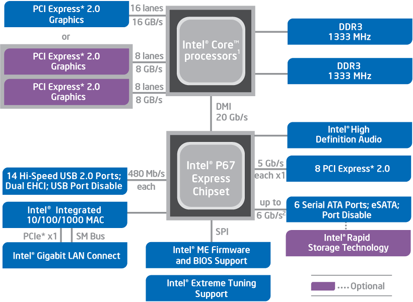 Однако тут сразу же напрашивается новый вопрос. Как вы уже, наверное, знаете, встроенное видеоядро будет наличествовать во всех процессорах архитектуры Sandy Bridge. И если раньше, в эпоху Socket 1156, можно было, хоть и с натяжкой, сказать, что, мол, «дискретный» чипсет P55 предназначен в пару к старшим Core i5/i7 без интегрированной графики, а «интегрированный» H55/H57 — в пару к младшим моделям этого сокета, встроенное видео имеющим, то сейчас, видимо, придется утверждать, что H67 — идеальное решение для любой системы с Socket 1155, а материнские платы на P67 непонятно зачем выпущены? Понимая это, компания Intel заранее озаботилась «укреплением позиций» своего «дискретного» представителя в линейке. Во-первых, в новом поколении чипсетов сохранилось и второе различие между P55 с одной стороны и H55/H57 с другой: поддержка конфигураций из нескольких видеокарт по-прежнему доступна только в платах на базе «дискретного» P67, хотя собственно контроллер графического интерфейса PCI Express 2.0 x16 все так же расположен в процессоре и мог бы, теоретически, «разрешить» SLI/CrossFire, то есть разбивать графический интерфейс на 2 по x8, и для H67.