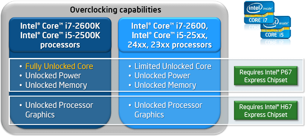Во-вторых (все-таки аргумент в виде SLI/CrossFire подействует на слишком незначительную часть аудитории, а графическое ядро — вот оно, чего б его не использовать задаром-то?), введен и новый принцип дистанцирования чипсетов — по возможностям для «официального разгона». Вы могли уже вкратце ознакомиться с ними в обзоре первых процессоров на ядре Sandy Bridge: позволяется увеличивать множители для режима Turbo Boost до +4 на ядро, а у специальных моделей с индексом K увеличивать множитель штатного режима работы до неограниченных на практике высот; можно достаточно свободно поднимать множитель на память (реализуя режимы работы DDR3, далеко выходящие за рамки стандарта; другой вопрос — зачем это нужно) и, наконец, переписывать ограничения по току и тепловыделению. Однако все это счастье будет доступно лишь владельцам материнских плат на базе P67. А что же H67? Он тоже предлагает кое-что «официально разогнать», и даже объект разгона вполне логичный и не пересекающийся с возможностями «дискретной» системы — частота встроенного в процессор видеоядра. Таким образом, сделано все, чтобы платы на P67 покупались «энтузиастами», а H67 должен прочно ассоциироваться с пользователями встроенной графики.