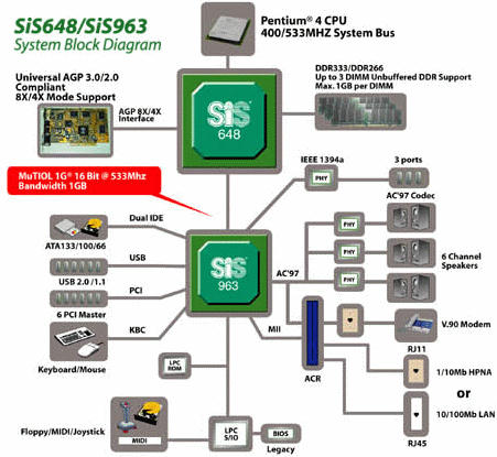 Более никаких новых технологий в северном мосте чипсета нет, работа с процессорами Pentium 4 с FSB 533 МГц подразумевается сама собой. Что же касается поддержки будущих Pentium 4 с Hyper-Threading, то здесь пока ничего однозначно утверждать нельзя, но по всей видимости, SiS выпустит обновленную ревизию северного моста, которая будет работать с ними гарантированно. Еще одним стоящим упоминания моментом является поддержка в SiS648 протокола для обмена данными с южным мостом SiS963 по ускоренному варианту шины MuTIOL (MuTIOL 1G) с пропускной способностью 1 ГБ/с. Ускорение (двукратное) достигается за счет перехода к передаче данных по технологии QDR (4 раза за такт) в отличие от использовавшегося ранее режима DDR (2 раза за такт). Нельзя сказать, что прежних 533 МБ/с реально не хватало, но мешать это нововведение никак не должно, а то, что SiS технологически способна «тренироваться» заранее, безусловно, можно поставить компании только в плюс.
