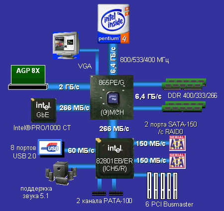 | Чипсет | Intel 865PE (RG82865PE + FW82801ЕR) | Intel 865G (RG82865G + FW82801ЕB) | Intel 865P (RG82865P + FW82801DB) | |
