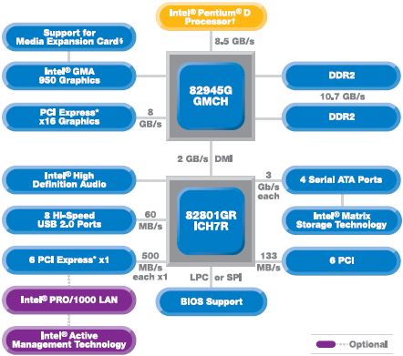 - Шина DMI (с пропускной способностью ~2 ГБ/с) до южного моста ICH7/R;