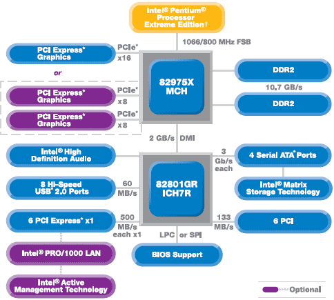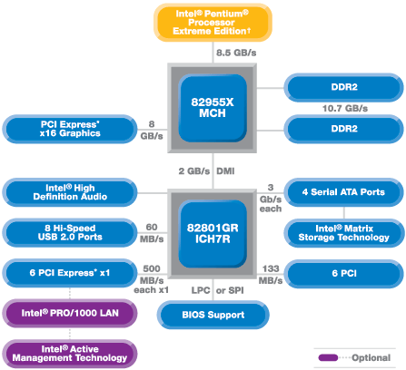 Впрочем, стоит отметить, что, в силу разницы в сроках выхода в свет, i975X поддерживает процессоры нового поколения Intel Core 2 Duo/Extreme. От самого чипсета здесь ничего не зависит, но официальная поддержка Core 2 дарована маркетологами только одному топовому решению, равно как и первые четырехъядерные процессоры должны официально заработать только в платах на базе i975X. Системные платы на i955X с процессорами новой микроархитектуры несовместимы.