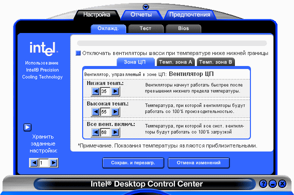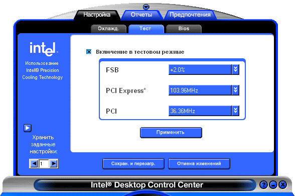 Закладка «Настройка > Тест» позволяет включить так называемый «тестовый режим», что в случае с платами Intel является эвфемизмом, позволяющим не называть кошку кошкой, и избежать употребления термина «оверклокинг». Установки закладок «Охлаждение» и «Тест» (в комплексе т.е. все три пороговых температуры + частоты FSB, PCI, и PCI Express) могут быть записаны в один из четырех профилей (см. на скриншоте «Хранить заданные настройки: … »). Профиль с нулевым номером является вызываемым по умолчанию, остальные могуть быть активированы вручную. К вопросу о том, как это делается, мы вернемся чуть позже.