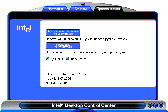 Закладка «Отчеты» является минималистичным аналогом программы диагностики оборудования и позволяет получить краткую информацию об аппаратной начинке системы. «Предпочтения» еще более лаконичная закладка, она позволяет вернуться к параметрам по умолчанию, инициировать процедуру проверки наличия вентиляторов с возможностью контроля оборотов, а также выбрать формат отображения значений температуры градусы Цельсия или Фаренгейта.
