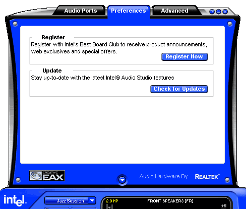 Вторая закладка, несколько нелогично, на наш взгляд, названная «Preferences», позволяет (точнее, декларирует возможность) проверить наличие свежей версии Audio Studio, а также содержит кнопку для вызова процедуры онлайновой регистрации в Best Board Club. Мы не зря употребили выражение «декларирует возможность», потому что нажатие на кнопку «Check for updates» на самом деле просто отправляет нас на страничку Audio Studio на сайте Intel, но выяснение вопроса о том, какая версия IAS стоит на компьютере пользователя, и насколько она свежа оставляет выяснять самому пользователю. Поэтому нам данная функция программы показалась несколько… употребим самый мягкий термин «недоделанной».