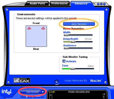 Закладка «Advanced» позволяет изменять предустановки виртуального окружения (фактически параметры реверберации), давая возможность подстраивать их под свой вкус, и регулировать частоту среза у фильтра низких частот (называется это «Sub-Woofer Tuning»). Достаточно неплохая идея, но реализована она, с нашей точки зрения, несколько неполно: действительно, возможность создания пользовательских пресетов окружения, наверное, будет востребована но наиболее логичным было бы дать пользователю возможность именно создавать собственные пресеты, параметры же предустановленных, наоборот, заблокировать. Вместо этого нам предлагают лишь изменять уже существующие. Таким образом, если нам нужен пресет для какого-нибудь «очень длинного коридора» придется записывать его куда-нибудь в «Theater» или «Cathedral» (имя предустановленных пресетов изменить невозможно).