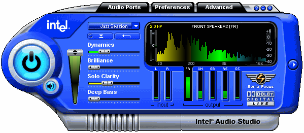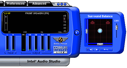 Опять-таки: «поразить в самое сердце» Intel Desktop Utilites нас не смогли. Наверное, это было просто невозможно список необходимых функций, которые должны поддерживать подобного рода программы, практически совпадает со списком функций достаточных, поэтому все хорошие пакеты системного мониторинга очень похожи друг на друга и большее количество отличий приходится на интерфейс. Интерфейс IDU достаточно внятен и логичен, к нему у нас претензий нет. Единственный серьезный недостаток данного пакета мы уже отметили абзацем выше. Остается повторить предыдущие выводы: владельцы компьютеров на базе плат Intel вполне могут пользоваться Intel Desktop Utilites, не «заморачиваясь» поиском утилит от сторонних производителей. Разумеется, если для них не является критичным отсутствие возможности выключения компьютера в случае возникновения нештатной ситуации.Intel Audio Studio