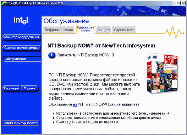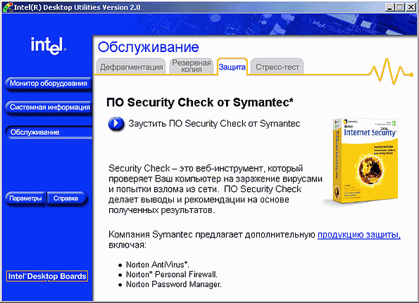 - Intel Desktop Utilites. Следует отметить, что Active Monitor — «уходящее», хоть и еще поддерживаемое ПО, и работает только с платами на базе i845x/865x/875P и еще более старыми. Для новых плат (чипсеты «девятисотой» серии) предназначен более функциональный пакет — Intel Desktop Utilites. Усовершенствования коснулись в основном функциональности: IDU отслеживает большее количество параметров, позволяет более тонко управлять режимами мониторинга, и т. д. Однако есть и принципиальное отличие — в полную версию пакета входит четыре сторонних программы: дефрагментатор Diskeeper Lite, пакет резервного копирования NTI Backup Now, ПО для проверки стабильности функционирования аппаратной части компьютера PassMark Stress Test и Symantec Security Check одновременно программа и web-служба, предназначенная для тестирования системы на предмет защищенности от хакерских атак. Напомним: все это вы получаете вместе с пакетом Intel Desktop Utilites совершенно бесплатно.