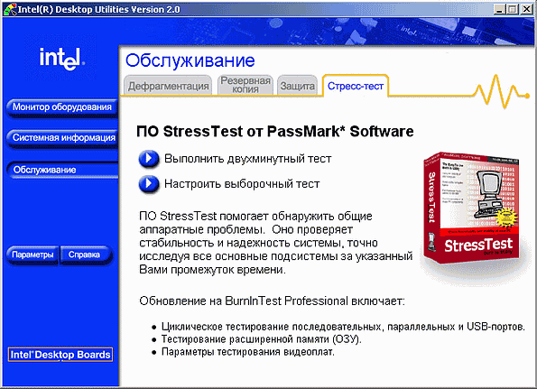 Боковая закладка «Обслуживание» предназначена для запуска внешних программ, идущих в комплекте с Intel Desktop Utilites. Следует заметить, что IDU существует в двух вариантах: полный, со всеми дополнительными программами, и урезанный, из которого они исключены. Бесплатны и доступны для загрузки с сайта Intel оба варианта поставки, но пользователей модемов может смутить размер первого: он составляет порядка 50 мегабайт (урезанный порядка 7 мегабайт). Названия программ и их назначение вполне понятны из скриншотов, приведенных ниже.