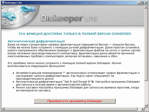 Впрочем, строго говоря, встроенный дефрагментатор Windows XP это и есть Diskeeper Lite, только оттуда убраны все лишние кнопки, вызывающие функции, недоступные в Lite-версии. А вот у инсталлируемого вместе с DCC «родного» Lite-дефрагментатора от Executive Software, они присутствуют, но нажатие вызывает лишь появление надоедливого окошка, уговаривающего приобрести полную версию: