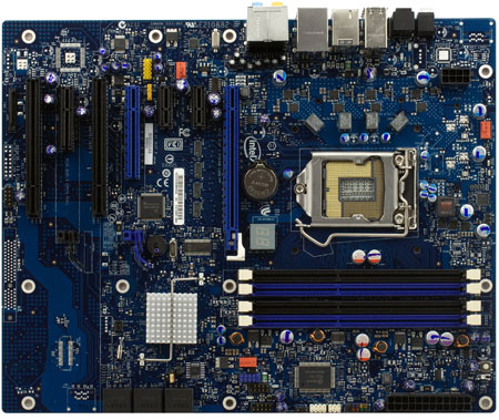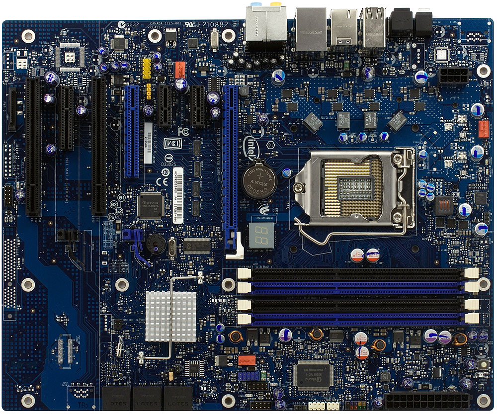 Задняя панель почти идентична той, что мы видели у старшей платы на P55 в ассортименте Intel, за вычетом двух разъемов eSATA. Зато на месте остались куда менее необходимые оптический вход Toslink и кнопка для входа в BIOS Setup с параметрами по умолчанию, полезность которой в данном случае совсем уж неочевидна — вряд ли многие будут приобретать модель с четырехканальным питанием процессора под нужды разгона. Тем более что, вопреки опасениям увидевших данную кнопку, Intel предусмотрела и возможность автоматической «аварийной» загрузки при переразгоне. Удобство кнопки заключается лишь в том, что при ее использовании все настройки в BIOS Setup будут на месте, и их можно будет быстро подправить, а автоматическая процедура восстановления их сбрасывает.