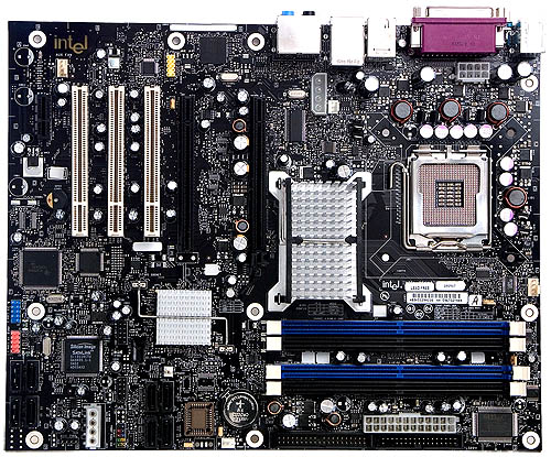 Разводка платы в целом стандартная, хотя Intel часто использует вариант дизайна, при котором полноразмерная ATX-плата превращается в mATX-модель путем «отрезания» края платы (см., например, Intel D925XCV). В таких случаях эта «отрезаемая» область (левый край на фотографии) не содержит практически никаких функциональных элементов кроме пары PCI-слотов и, возможно, еще нескольких разъемов, но в нашем случае видим именно «полноценный» дизайн с использованием всего пространства текстолита. Сразу бросается в глаза обилие разъемов питания и непривычно большой и высокий игольчатый радиатор на северном мосту, который, однако, не мешает установке нестандартных кулеров на процессор, кроме имеющих совсем уж широкий радиатор. При сборке системы обеспечена некоторая путаница проводов и шлейфов, обусловленная большим количеством разъемов в правой (на фотографии) части платы, к тому же затруднено и само подключение кабелей, а при установке видеокарты в основной разъем PCIEx16 модули памяти блокируются в разъемах. Кроме того, устанавливаемая во второй слот PCIEx16 видеокарта нижним краем будет «лежать» на радиаторе южного моста чипсета.