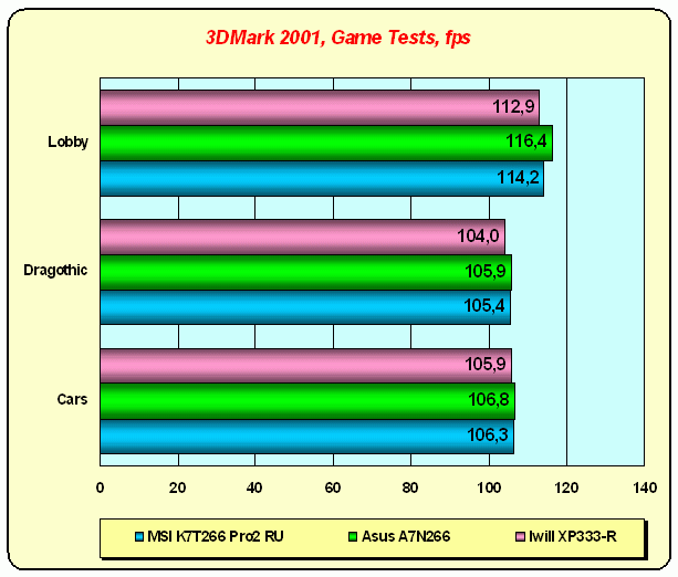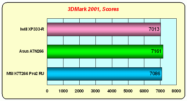 Вот все и стало на свои места. Низкоуровневый тест "обмануть" трудно, он сосредотачивается на измерении одной-единственной функции чипсета, зато делает это тщательно и хорошо. MAGiK 1 действительно почти догнал KT266A по скорости чтения из памяти, но проигрывает продукту VIA по скорости записи. Кстати, обратите внимание на nForce — этот чипсет тоже не сильно оторвался от KT266A по скорости чтения, но по скорости записи отставил далеко позади всех остальных. Еще один Intel что ли? :)