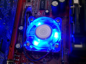 Плата отлично смотрится: на свету благодаря подобранным в тон текстолиту слотам и некоторым разъемам; в темноте системного блока благодаря кулеру на чипсете, сделанному из прозрачного пластика и подсвечиваемому тремя светодиодами. Помимо чисто внешней привлекательности плата обладает также большим набором интегрированных контроллеров, так что способна заинтересовать многих потенциальных покупателей.