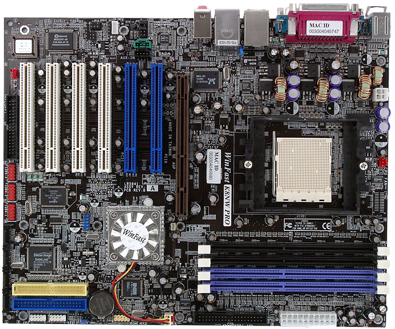 А вот K8NFX… Она, судя по информации Leadtek, предназначена для процессора Athlon 64 FX. Причем только для него! Странно  зачем выпускать плату, отличающуюся от другой только тем, что она не поддерживает один из двух возможных типов процессоров? Нам ход мыслей производителя в данном случае понять не удалось… Впрочем, зайдя на страницу спецификаций K8NFX, мы с удивлением обнаружили, что она просто скопирована… со страницы K8NW! Причем скопирована на скорую руку  даже сама плата на этой странице называется «K8NW»! Эх, господа, ну что ж так неаккуратно-то? В таком случае, предположить можно самый простой ответ: после объявления AMD процессора Athlon 64 FX, Leadtek просто захотела лишний раз «засветиться» с «новой» платой под него, ну а поскольку самой новой платы «в загашнике» не было, решили с этого момента продавать еще под одним названием старую. М-да… дремучи они, дебри маркетинга, и заблудиться в них с непривычки более чем легко…