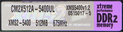 Руководство по расшифровке Part Number модулей памяти DDR2 серии XMS2 на сайте производителя отсутствует. В техническом описании (datasheet) модулей указано, что рассматриваемый продукт является комплектом из двух модулей DDR2-667 емкостью по 512 МБ каждый, основанных на микросхемах 64M x8. Гарантируется 100% стабильная работа в режиме «DDR2-675» с чипсетами Intel при таймингах 3-3-2-8, что требует значительно большего по сравнению с номиналом питающего напряжения 2.1V. Запрограммированные в SPD значения таймингов значительно выше 4-4-4-15. Данные микросхемы SPD модуля