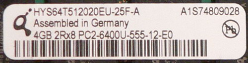 Модули объемом 4 ГБ основаны на 16 микросхемах в BGA-упаковке в конфигурации 512M x 64. Производитель гарантирует стабильную работу модулей в режиме DDR2-800 при таймингах 5-5-5 (значение RAS в описании не упомянуто, а по SPD равно 18) и питающем напряжении 1,8 В, этот режим и выбран в микросхеме SPD в качестве режима по умолчанию. Продаются модули в OEM-варианте поставки, соответственно, никакого отбора и объединения в 2-канальные комплекты производитель не предлагает. Данные микросхемы SPD модуля