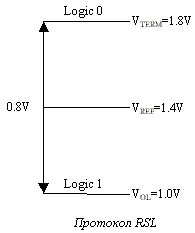 Следующим шагом, направленным на уменьшение задержек, связанных со временем переключения транзистора между активными логическими уровнями, является введение дифференциального протокола — переключение между уровнями логического "0" и "1" происходит не по достижении конечного значения напряжения, а несколько ранее. Введение же линии опорного напряжения помогает осуществлять прецизионный контроль за возможными амплитудными девиациями протокола. Например, в RSL, при использовании линии опорного напряжения 1.4 В, уровень логической "1" соответствует промежутку 1.2-1.0 В, а уровень логического "0" — 1.6-1.8 В. Поэтому значение 1.2 В можно считать "1", а уровень 1.6 В — "0", причем реальная логическая дискретность теперь составляет всего-навсего 0.4 В. Контрольным порогом срабатывания является точка пересечения реального и дополняющего сигналов (VX — cross-point), уровень которой составляет 50% от разности уровня опорного напряжения и порога переключения между активными уровнями, оговоренных сигнальным протоколом. Данная псевдодифференциальная схема позволяет не только компенсировать задержки на переключение, но и значительно снизить влияние ЭМИ за счет уменьшения длительности шума коммутации сигнала.