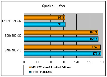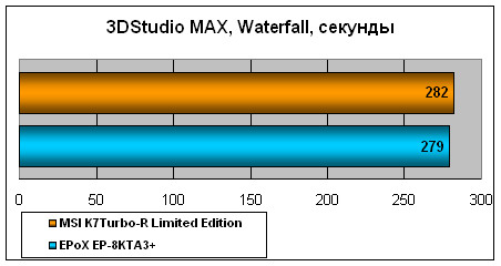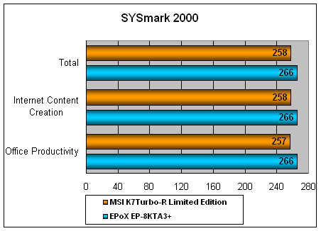 Мы еще остановимся на производительности как таковой в выводах (советуем дочитать), а пока… Что ж, давайте посмотрим на диаграммы. Как легко заметить, плата MSI практически везде отстает от EPoX 8KTA3+, причем налицо независимость этого отставания от тестового ПО. Что позволяет сделать вывод: "тенденция, однако" :) Но если уж начали определять тенденции, то давайте продолжим в том же ключе.