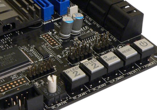 Зато аппаратный регулятор тонкой подстройки частоты, который находится рядом с кнопками включения, перезапуска, сброса настроек и активирования GreenPower (динамическое управление количеством задействованных фаз в стабилизаторах напряжения), работает как обещано. То есть позволяет тем, кому почему-либо не нравится пользоваться, например, программными средствами AMD OverDrive «подкрутить» опорную частоту в режиме реального времени. Вероятно это очень эффектно будет смотреться на каких-нибудь оверклокерских соревнованиях.