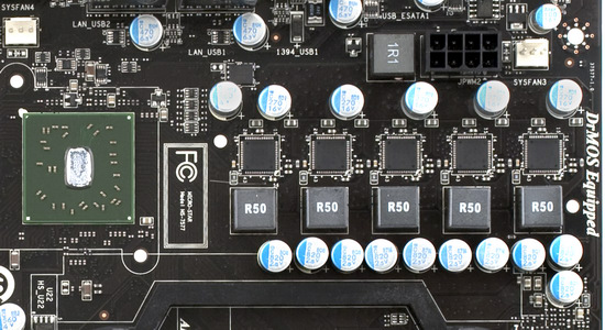 Стабилизатор напряжения питания процессора на интегральных преобразователях от компании Renesas (R2J20504), объединяющих в себе и полевые транзисторы, и их драйвер. Схема получается более компактная, по сравнению с традиционной, а благодаря более высокой эффективности преобразования, через каждую фазу можно пропускать более высокий ток. В отличие от ранее протестированной модели DKA790GX, где использовалась гибридная схема, в данном случае такие преобразователи установлены во всех 5 каналах. В схеме установлены 10 конденсаторов — по 820 мкФ и 5 — по 270 мкФ, все конденсаторы на плате — твердотельные, японского производства.