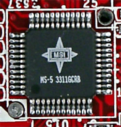 Также на плате установлен специальный заказной чип, с помощью которого MSI реализовала свою фирменную технологию CoreCell. Не вдаваясь в детали, это все та же самая оверклокерская функциональность, то есть управление напряжениями и частотой, но только «более тонкая» позволяющая, к примеру, изменять напряжение питания с шагом не 0,05, а 0,0125 В и т. п. Кроме того, не исключен вариант, что при наличии на плате данного чипа именно через него идет управление соответствующими параметрами со стороны всевозможных утилит «интеллектуального разгона», типа MSI Fuzzy Logic.