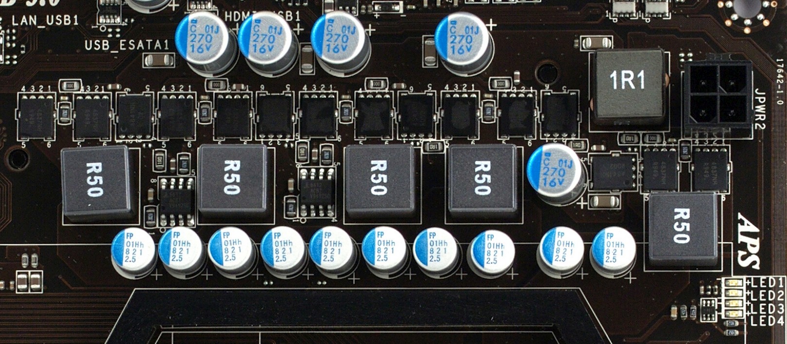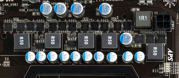 Стабилизатор напряжения питания процессора — 5-канальный, установлено по 3 полевых транзистора во всех каналах, 10 твердотельных конденсаторов по 820 мкФ и 4 — по 270 мкФ. Поддерживаются процессоры с заявленным TDP до 140 Вт. Реализована технология Active Phase Switching, поддерживающая динамическое отключение неиспользуемых каналов стабилизатора при работе с частичной нагрузкой, причем ее можно включать и выключать отдельным пунктом из BIOS, а процесс управления визуально отображается с помощью светодиодной линейки.