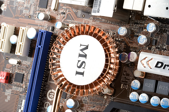Система охлаждения на плате весьма оригинальная. В MSI не устают подчеркивать, что форма радиатора на северном мосту выбрана не только из эстетических соображений, но и в виду ее особой эффективности. Сложно сказать: насколько это так, но вот круглые шляпки с надписью MSI на обоих радиаторах явно не способствуют лучшему охлаждению. Фактически остается надеятся, что кулеры будут создавать поток воздуха в горизонтальном направлении и заодно протягивать воздух через эти конструкции. Впрочем, данный чипсет вполне позволяет проектировать системы охлаждения хотя бы и прямо исходя не из соображений эффективности, а внешности платы, к тому же лепестки основного радиатора выступают из под таблички на достаточное расстояние, и в целом, претензий нет, нагрев оставался вполне умеренным даже в разгоне графического ядра .