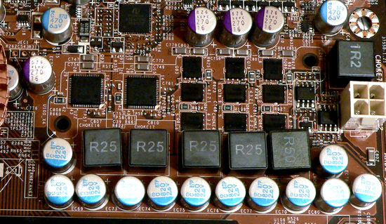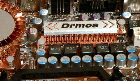 Все же прогрессивная конструкция — это хорошо, но не стоит пренебрегать и традиционными мерами, а если необходимо сэкономить, то в данном случае вполне можно было обойтись без тепловой трубки между чипсетными радиаторами, соединив ею же радиаторы на северном мосту и стабилизаторе напряжения. Не исключено, что в таком случае, плата бы побила все рекорды, установленные ранее, стабильность питания, судя по результатам, достигнутым на остальных процессорах, выше всяких похвал. Частично улучшить охлаждение может помочь удаление фирменной таблички с этого радиатора (она явно никак не способствует протягиванию воздуха через ребра радиатора, слишком мала его высота, чтобы рассчитывать на такой эффект, а вот естественной циркуляции нагретого воздуха мешает).