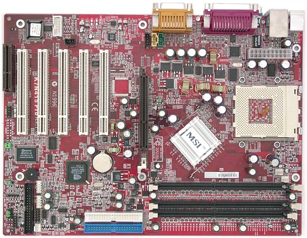 Краткие характеристики платы: разъемы памяти — 3 DDR SDRAM; слоты расширения — AGP/ 5 PCI/ CNR; порты ввода/вывода — 2 COM/ LPT/ 2 PS/2/ 6 USB 1.1; размеры — 305х225 мм.