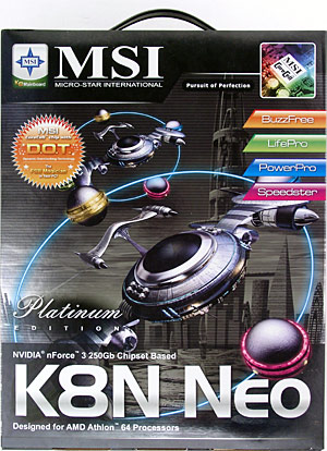 Плата высшего уровня, самый функциональный продукт компании под Socket 754. Этот процессорный сокет медленно сходит со сцены (точнее, переходит в low-end в понимании маркетологов AMD), но на текущий момент все еще позволяет получить систему, не уступающую, по большому счету, никому на настольном рынке. Именно на тех, кто собирается строить высокопроизводительный компьютер на этой платформе, рассчитана топовая модель серии MSI K8N Neo.