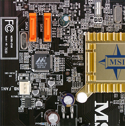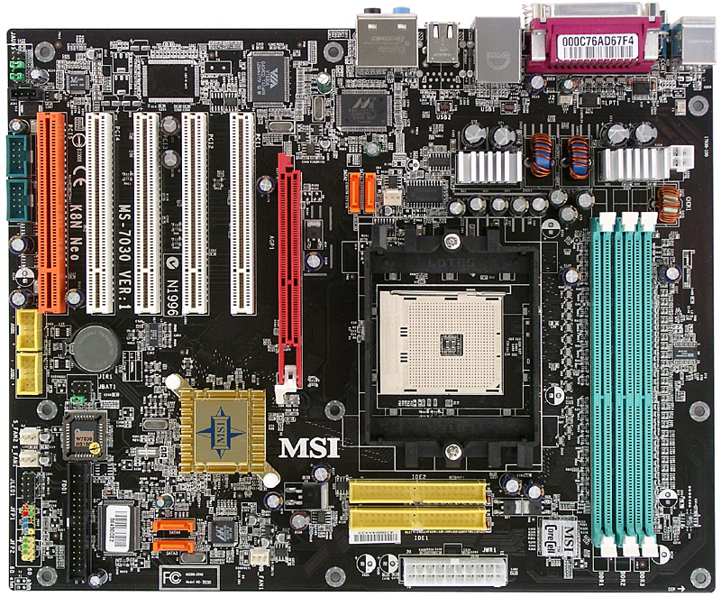 Не совсем обычная разводка с расположением разъемов памяти параллельно слотам AGP/PCI. Впрочем, удобство сборки от этого только увеличивается, а недостатками остаются расположение ряда разъемов вдоль левого края платы (трудно подключать кабели), разъема FDD (слишком далеко от 3-дюймовых отсеков в высоком корпусе) и двух разъемов SATA рядом с задней панелью платы (неудобно размещать кабели в корпусе). Доступ к единственной имеющейся перемычке может быть затруднен при установке карт расширения, краткое описание ее функциональности приведено на текстолите платы. В двухканальном импульсном стабилизаторе напряжения питания процессора применены 8 конденсаторов по 1500 мкФ и 4 по 820 мкФ, полевые транзисторы в этой цепи прикрыты радиаторами (фирменная особенность плат MSI). Также на плате находятся стабилизаторы напряжения шины AGP (включающий 2 конденсатора по 1000 мкФ) и памяти (2 по 1000 мкФ).