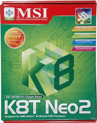 На текущий момент MSI предлагает две модели под Socket 939, основанные на чипсете VIA K8T800 Pro. Описываемая является топовой, у нее отсутствуют разведенные, но не распаянные элементы. Младшая модель  K8T Neo2-F: у нее отсутствуют контроллер FireWire и дополнительный ATA133/SATA RAID-контроллер. Размер платы  305х245 мм (полноразмерный ATX, крепление к корпусу девятью винтами, все края платы жестко фиксированы). Для осуществления системного мониторинга используются возможности микросхемы Winbond W83627THF. Контролируются: