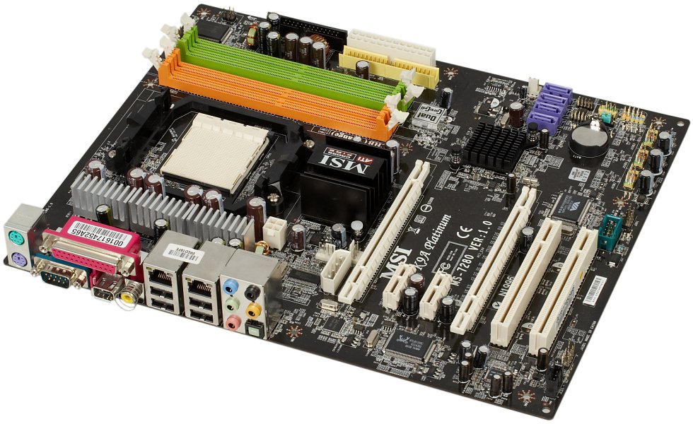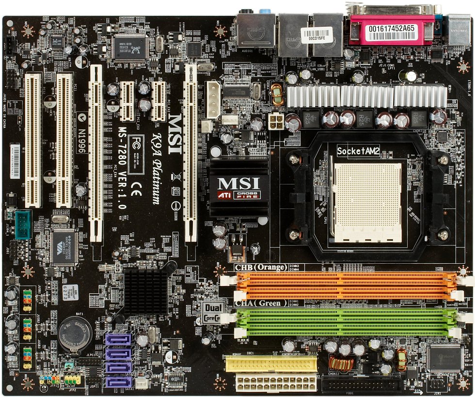 Разведенных, но не распаянных элементов на плате нет — линейка MSI пока включает лишь одну модель на чипсете ATI CrossFire Xpress 3200, и ее дизайн уникален. Размер платы — стандартный ATX (305?245 мм), крепление к корпусу девятью винтами с надежным креплением всех углов.