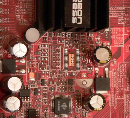 Интересная деталь — наличие разводки для установки выделенной памяти для видеоядра (так называемой — Hyper-Memory), к сожалению, сама микросхема не установлена, а в описании платы никакого намека на существование версии с поддержкой видеобуфера мы не обнаружили. Возможно, оставлен запас на будущее или, наоборот, в целях экономии, после перевода Radeon Xpress 1150 в разряд дешевых решений, пришлось отступить от первоначального замысла. Также на плате предусмотрена разводка для FireWire-контроллера, который, несмотря на явное указание на стикере литеры «F», отсутствовал (как оказалось, эта буква указывает на версию сетевого контроллера, причем опять же не Fast Ethernet, как можно подумать, а именно гигабитного, действительно, присутствующего на данной плате). Теоретически вы можете встретить такую плату с Fast Ethernet контроллером (теперь вы знаете, как ее отличить) и DVI-разъемом на задней панели, установленным наряду с VGA. Возможны и другие вариации (отсутствие/наличие ТВ-выхода, S/PDIF In/Out), и если перечисленные компоненты для вас актуальны, рекомендуем при покупке обращать внимание на комплектацию приобретаемой платы. Размер платы — microATX (245?245 мм), крепление к корпусу 8 винтами, незакрепленным остается правый нижний угол.