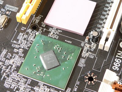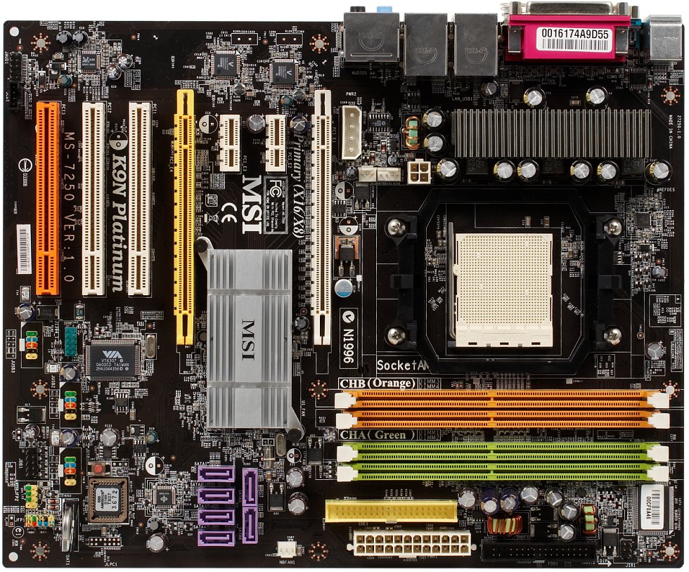 Обращает на себя внимание пассивное охлаждение чипсета: для nForce4 такое решение было экзотикой, тогда как для 500-й серии обещает стать типичным явлением. Инженеры MSI использовали длинный низкопрофильный радиатор, причем он не отцентрирован по чипу, а нависает одним краем над платой и притянут к ней через изолирующую прокладку. Греется радиатор существенно, но поскольку спецификации чипа допускают работу при температуре до 90°C, а собственное тепловыделение у nForce5 снизилось, активное охлаждение не обязательно. И все же «одночиповые» решения от NVIDIA остаются высокоинтегрированными и предсказуемо греются сильнее конкурентов (хоть и, подчеркнем, заметно меньше nForce4). Хотя на штатных частотах плата работала стабильно, но если вы планируете испытывать систему в разгоне, дополнительное охлаждение не помешает. Впрочем, серии для энтузиастов (в частности, MSI Diamond) будут по-прежнему снабжаться усиленным охлаждением чипсета.
